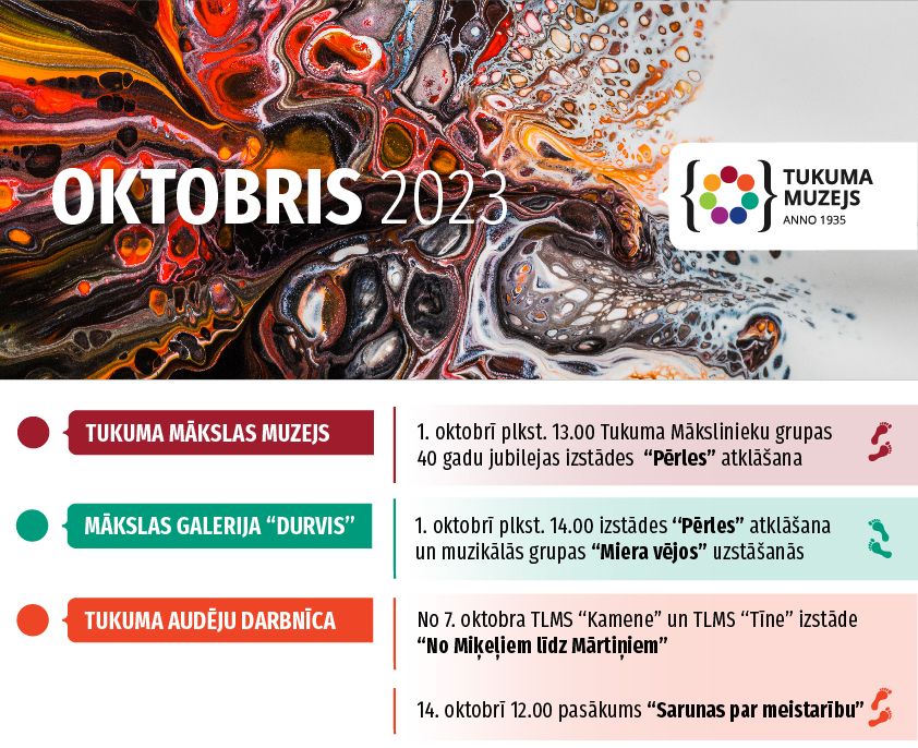 Tukuma Mākslas muzejā un Mākslas galerijā “Durvis” skatāma divdaļīgā izstāde “Pērles”. Izstāde tapusi, atzīmējot Tukuma Mākslinieku grupas 40. jubileju. Šajā jubilejas izstādē mākslinieki parāda savus darbus, kas raksturo katru autoru, tā radot daudzkrāsainu iespaidu par tik atšķirīgo mākslinieku raksturu, dzīvi un pieredzi.