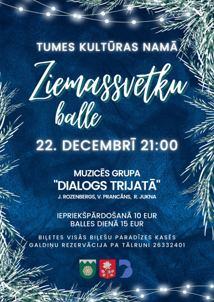 Ziemassvētku balle Tumes kultūras namā būs 22.decembrī pulksten 21:00. Muzicēs grupa “Dialogs trijatā”.