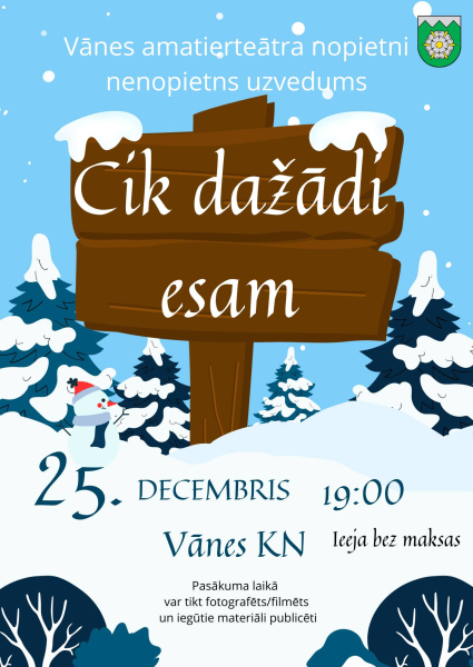 Bet Vānes kultūras nama amatierteātris 25.decembrī pulksten 19:00 iepriecinās ar izrādi “Cik dažādi esam” Vānes kultūras namā. I