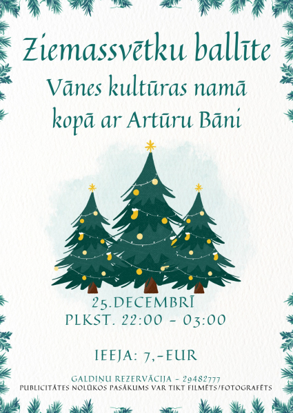 Ziemassvētku balle Vānes kultūras namā būs 25.decembrī no pulksten 22:00. Par mūziku rūpēsies Artūrs Bānis.