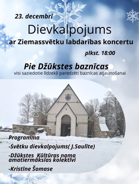 23.decembrī pulksten 18:00 pie Džūkstes baznīcas būs svētku dievkalpojums. Labdarības koncertā piedalīsies Džūkstes kultūras nama amatiermākslas kolektīvi, kā arī Kristīne Šomase.