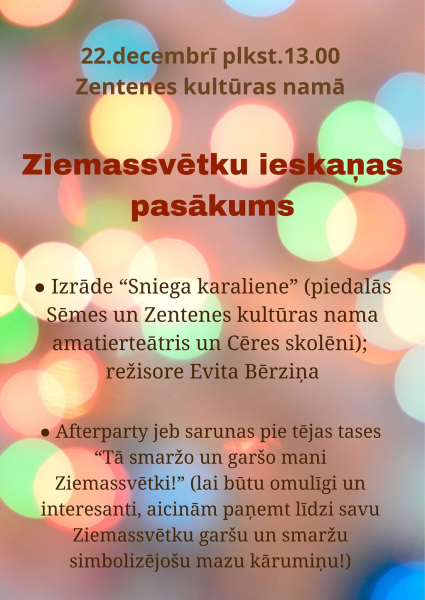 Ziemassvētku ieskaņas pasākums ar izrādi “Sniega karaliene” Zentenes kultūras namā būs 22.decembrī pulksten 13:00.