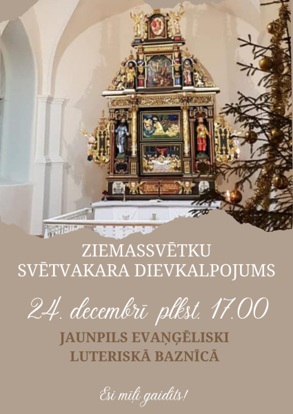Arī Jaunpils ev.lut.baznīcā 24. decembrī pulksten 17.00 būs Ziemassvētku svētvakara dievkalpojums. Apmeklētājiem lūgums saģērbties silti, jo baznīca šobrīd nav apkurināma.