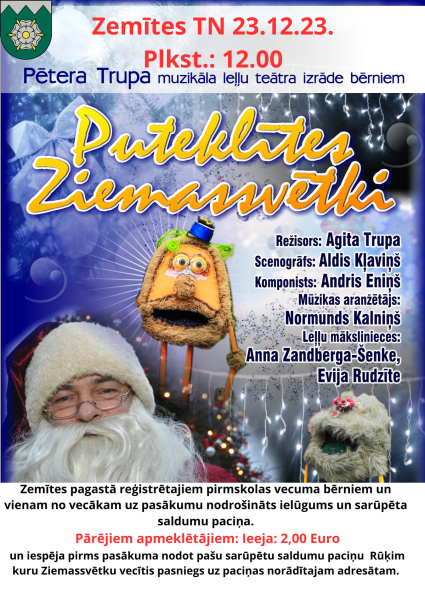 Arī Zemītes tautas namā 23.decembrī pulksten 12:00 būs noskatāma brīnišķīga muzikāla leļļu teātra izrāde bērniem – “Puteklītes Ziemassvētki”. Zemītes pagastā reģistrētajiem pirmsskolas vecuma bērniem un vienam no vecākiem uz pasākumu nodrošināts ielūgums un sarūpēta saldumu paciņa.