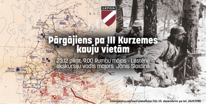23.decembrī pulksten 9.00 notiks pārgājiens pa III Kurzemes kauju vietām maršrutā Rumbu mājas – Lestene. Ekskursiju vadīs majors Jānis Slaidiņš. Informācija pa tālruni 26247095.