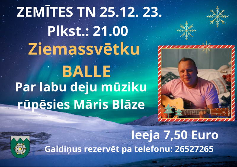 Arī Zemītes tautas namā Ziemassvētku balle būs 25.decembrī no pulksten 21:00. Par labu deju mūziku tajā rūpēsies Māris Blāze. Gal