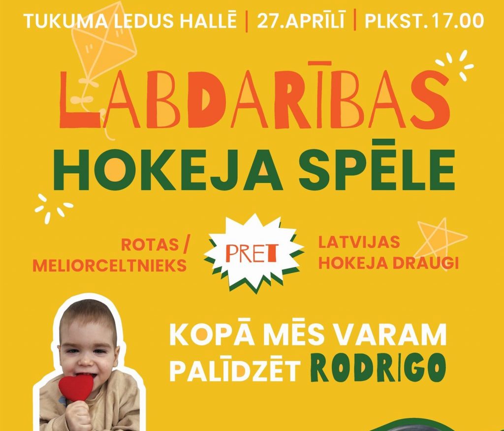 Rodrigo, kuram šī gada 18. aprīlī paliek divi gadi, dzīvo ar smagu diagnozi — bērnu cerebrālā trieka tetraparēze, kas ievērojami ierobežo viņa kustību spējas. Lai uzlabotu savu veselību, Rodrigo apmeklē daudzas terapijas un nodarbības Talsos, Rīgā, Jūrmalā un Tukumā, tostarp audiologopēdijas, suņu terapijas, ABA terapijas un Montesori nodarbības. Rodrigo un viņa mammas lielākais sapnis ir delfīnu terapija, kas ir ļoti efektīva bērniem ar līdzīgām veselības problēmām, taču tās izmaksas ir augstas — aptuveni 7000 eiro par 15 dienām. Spēles laikā HK «Rotas/Meliorceltnieks» sacentīsies ar komandu «Latvijas Hokeja Draugiem», kurā spēlēs pazīstamas personības no sporta un mūzikas pasaules. Ieeja pasākumā būs par ziedojumiem, kas tiks novirzīti Rodrigo terapiju finansēšanai.