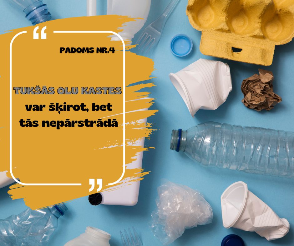 Tukšās kartona vai plastmasas olu kastītes teorētiski klasificējas kā izlietotais iepakojums. Taču tās tiek gatavotas no ļoti daudz reižu pārstrādātām otrreizējām izejvielām, tāpēc vēl vienai pārstrādei tās vairs nebūs lietderīgi piemērotas. Ja iemetīsi tās dalītās vākšanas konteinerā vieglajam iepakojumam, neko sliktu nebūsi izdarījis, jo tās visticamāk nonāk reģenerācijā. Taču vari būt drošs, ka šīs kastītes jau savu labo darbu vides labā ir paveikušas, un centieni pārstrādāt tās atkārtoti nebūs patērēto resursu vērti.