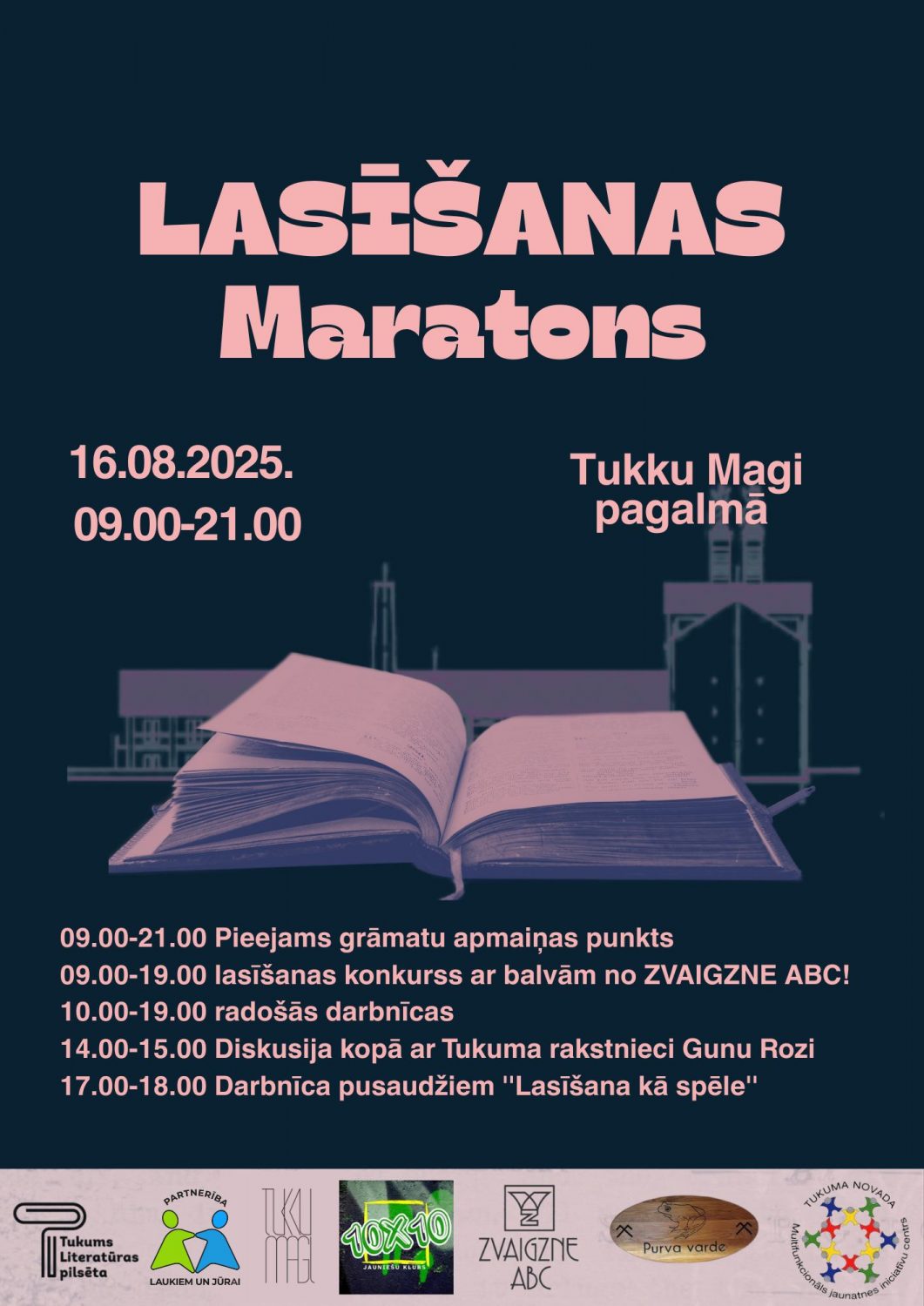 Pasākums aicinās gan lielus, gan mazus lasītājus piedzīvot grāmatu un radošo aktivitāšu dienu Tukku Magi pagalmā. Būs iespēja iepazīt dažādas literārās pasaules un piedalīties interaktīvās darbnīcās. Vieta iedvesmo gan lasīšanu, gan radošumu. Norises vieta: “Tukku Maggi” pagalms, Pasta iela 26, Tukums. Norises laiks: 16.08.2025 plkst. 09:00. Dalība: bez maksas. Vairāk informācijas: 26373318