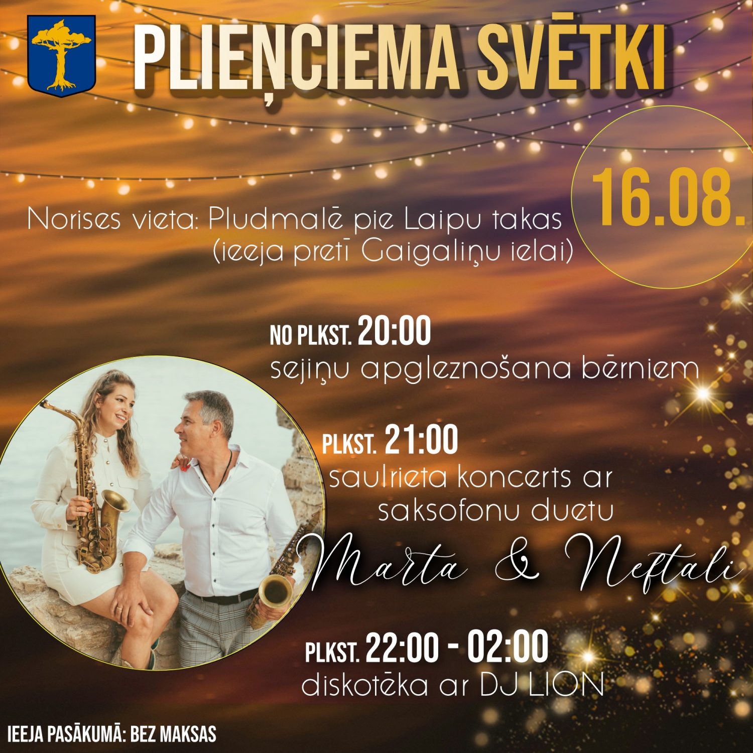 Plieņciemā pie Laipu takas norisināsies svētku pasākums ar dažādām aktivitātēm. Bērnu sejiņu apgleznošanas punkts piedāvā radošu izklaidi jaunākajiem viesiem, savukārt vakarā notiks saulrieta koncerts ar saksofonistu duetu Marta & Neftali. Pasākuma noslēgumā DJ Lion parūpēsies par muzikālo noskaņu un dejām. Svētki apvienos ģimenes aktivitātes, mūziku un brīvā laika pavadīšanu dabā. Norises vieta: Plieņciems, Tukuma novads. Norises laiks: 16.08.2025 plkst. 20:00. Vairāk informācijas: 63161234