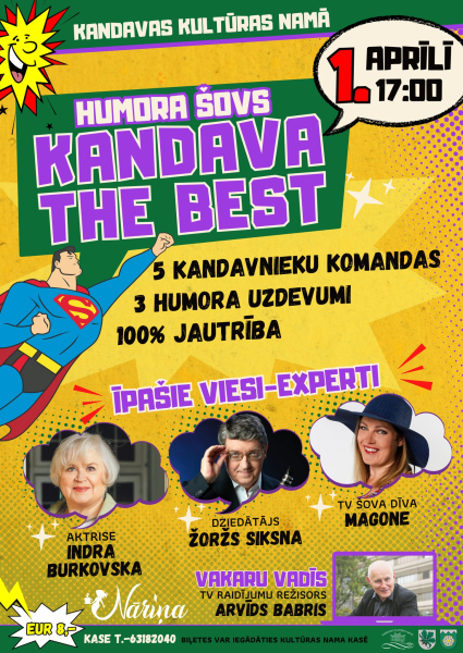 1.aprīlī pulksten 17:00 Kandavas kultūras namā būs Joku dienas humoršovs “KANDAVA THE BEST”. Pasākumā piedalīsies piecas dažādu interešu kandavnieku komandas. Katrai komandai būs jāiztur 3 pārbaudījumi: popiela, ēnu deja un modes iznāciens. Plašāka pasākuma programma www.kandava.lv.