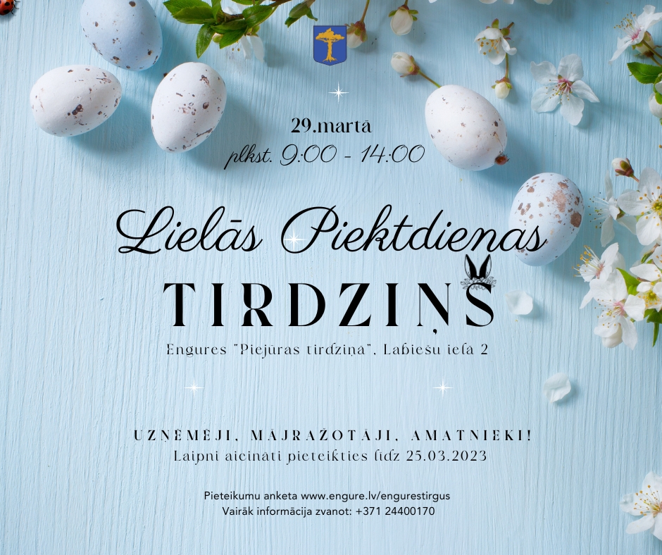 Visu Lieldienu svētku galdam nepieciešamo, kā arī kaut ko sevis un savu mīļo palutināšanai varēs atrast Lielās Piektdienas tirdziņā Engurē 29.martā no pulksten 9:00! Adrese: Engures tirdziņš, Labiešu iela 2, Engure, Engures pagasts, Tukuma novads.
