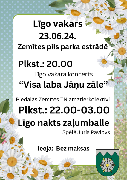 Zemītes pils parka estrādē 23.jūnijā no pulksten 20:00 tiks svinēts Līgo vakars ar koncertu “Visa laba Jāņu zāle”, kurā piedalīsies Zemītes tautas nama amatierkolektīvi. Bet no pulksten 22:00 līdz pat 3:00 Līgo nakts zaļumballi spēlēs Juris Pavlovs. Ieeja bezmaksas.