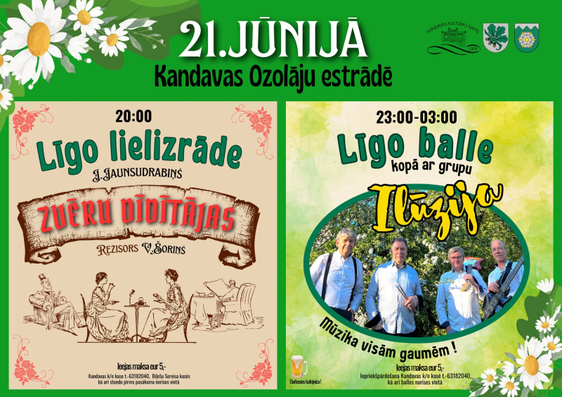 Savukārt Kandavas brīvdabas estrādē “Ozolāji” 21.jūnijā būs skatāma Līgo lielizrāde “Zvēru dīdītājas”. Režisors V. Šoriņš. Ieejas maksa 5 EUR. Pēc izrādes no pulksten 23:00 balli spēlēs grupa “Ilūzija”. Ieeja ballē 5 EUR.
