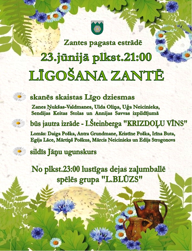Līgo svētkos Zantes pagasta estrādē pulksten 21:00 būs gan dziesmas, gan jautra teātra izrāde “Krizdoļu vīns”. Pēc pulksten 23:00 būs Līgo svētku zaļumballe ar grupu “L.Blūzs.