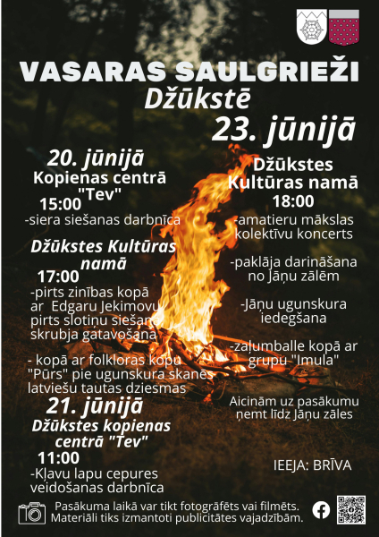 Vasaras saulgriežu svinības Džūkstē sāksies jau 20.jūnijā un turpināsies līdz pat 23.jūnijam. 20.jūnijā kopienas centrā “Tev” pulksten 15:00 būs siera siešanas darbnīca. Kultūras namā 17:00 varēs apgūt pirts zinības kopā ar Edgaru Jekimovu vai kopā ar folkloras kopu “Pūrs” baudīt latviešu tautas dziesmu skaņas pie ugunskura. Savukārt 21.jūnijā Džūkstes kopienas centrā “Tev” pulksten 11:00 darbosies kļavu lapu cepuru veidošanas darbnīca. Bet tieši Līgo vakarā, 23.jūnijā Džūkstes Kultūras namā no pulksten 18:00 būs amatieru mākslas kolektīvu koncerts, paklāja darināšana no Jāņu zālēm, Jāņu ugunskura iedegšana un vēlāk arī zaļumballe kopā ar grupu “Imula”. Ieeja – bezmaksas.