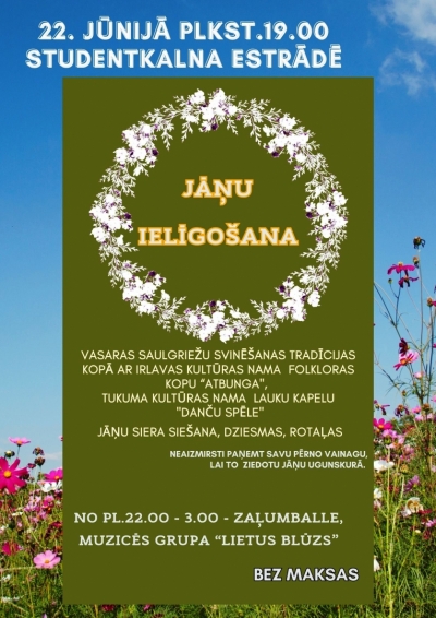 Ar dziesmām ieskandēsies pirmā vasaras nakts 20.jūnijā pulksten 21:00 Durbes estrādē Tukumā. Ugunskurā degs trejdeviņas pagalītes. Savienosies četras stihijas – uguns, zeme, gaiss, ūdens. Ziedojumi ugunij ar vēlējumu – “Lai top!”. Dalība bez maksas. ​Vasaras sākums šogad iestāsies 20. jūnijā pulksten 23:51. Vairāk informācijas www.tukumakn.lv