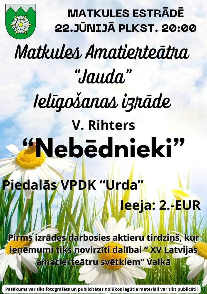 Līgo svētku priekšvakarā 22. jūnijā pulksten 20.00 Matkules estrādē būs baudāma Matkules amatierteātra “Jauda” ielīgošanas izrāde “Nebēdnieki”. Ieejas maksa 2 EUR. Pirms izrādes darbosies aktieru tirdziņš, kur ieņēmumi tiks novirzīti dalībai “XV Latvijas amatierteātru svētkiem” Valkā.