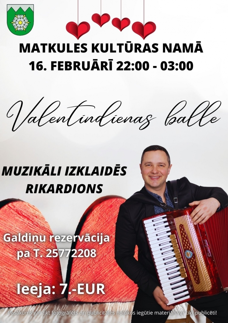 - februārī no pulksten 22.00 līdz 3.00 arī Matkules kultūras namā būs Valentīndienas balle. Spēlēs Rikardions. Galdiņu rezervācija, zvanot uz tālruni 25772208. I