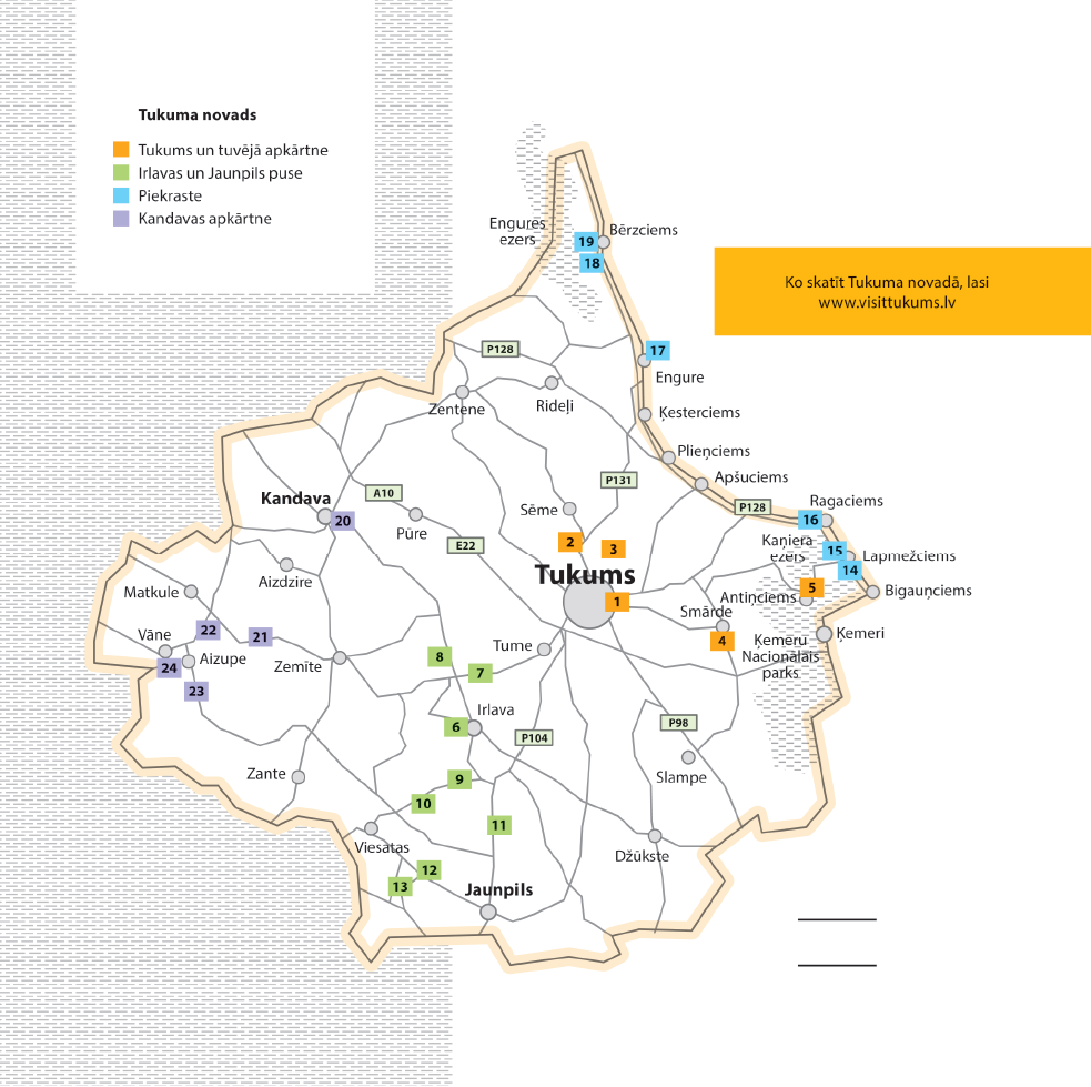 Tukumā pie sevis mājas kafejnīcā “Sloces pērles” uzņems Anita Vugule, šoreiz piedāvājot kantrī stila noskaņu savā dārzā. Tukuma pievārtē, Sēmes pusē mājas kafejnīcā “Vīnkalni” saimniekos Ketija Baldzēna, aicinot izbaudīt rudens aveņu valdzinājumu, bet Milzkalna tuvumā –Lolita un Pēteris Tutāni piedāvās “Pusdienu pieturu pinēju sētā”, kur pamieloties ar ēdienu, kā arī iepazīt pinēju arodu. Savukārt Smārdē pie Raivja Čilipāna atkal darbosies “Grieķu taverna”. Turpat netālu – Antiņciemā Sanita Matule Ķemeru Nacionālā parka ielokā veidos mājas kafejnīcu “Pļavā pie DAREs – Mednieka gaumē un dārza labumos”.