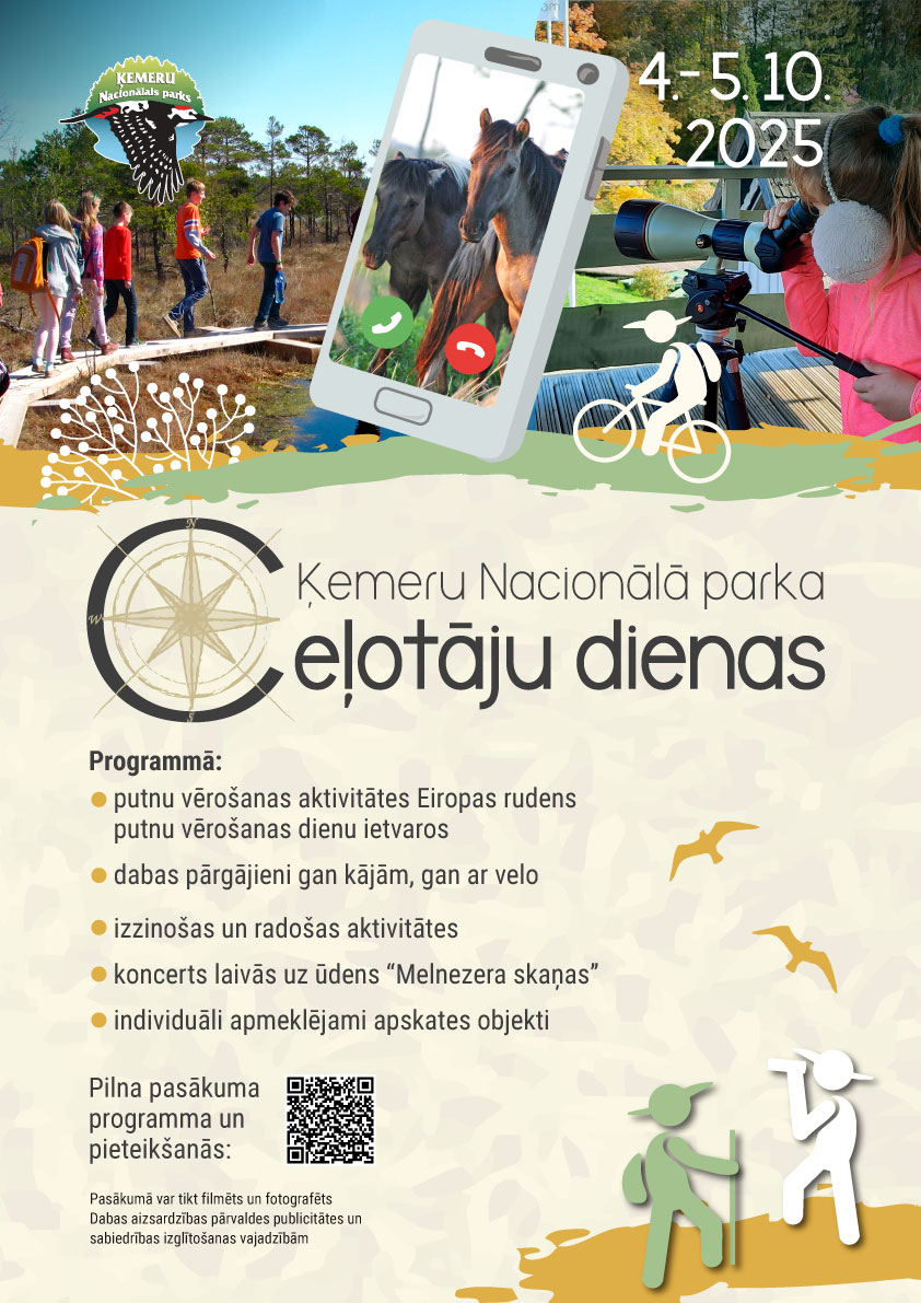 Ķemeru Nacionālais parks aicina doties dabā un atklāt to ar jaunu skatienu. Šogad pasākuma vadmotīvs “Daba stāsta – klausies, izzini, piedzīvo!” tas iedvesmos izzināt gan putnu pasauli, gan dabas noslēpumus dažādos veidos. Šī ir lieliska iespēja baudīt rudens krāsas, klausīties stāstos un ieraudzīt vairāk, nekā ierasts. Norises vieta: Meža māja (Ķemeru Nacionālā parka dabas un tūrisma informācijas centrs; DAP Pierīgas reģionālās administrācijas birojs), Jūrmala. Norises laiks: 4.10. – 5.10.2025 plkst. 22:00. Vairāk informācijas: 26424972