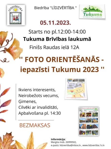 Visbeidzot brīvdienās aktīvi izkustēties aicina biedrība «Līdzvērtība». Proti, 5. novembrī 12.00 Brīvības laukumā, Tukumā, būs starts fotoorientēšanās sacensībām. Finišs paredzēts 14.00 Raudas ielā 12A.