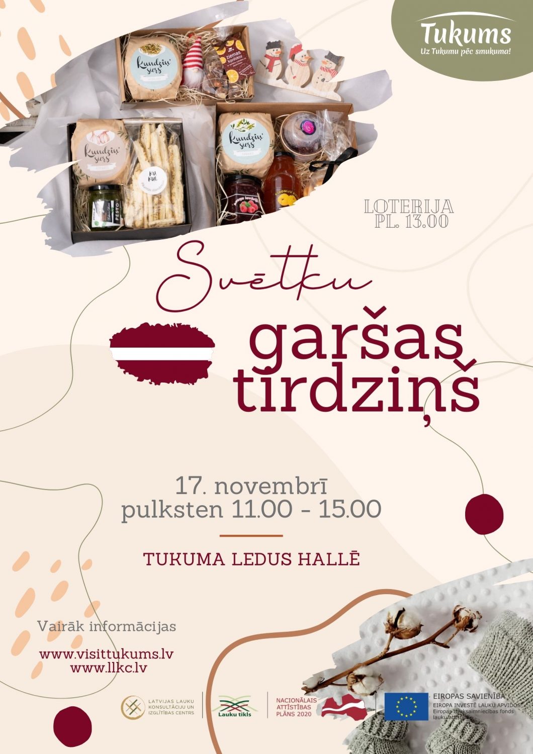 Tukuma ledus hallē 17. novembrī no plkst. 11:00 līdz 15:00 norisināsies “Svētku garšas tirdziņš”, kur jūs gaidīs dažādi mājražotāji ar gardumiem un amatnieki ar svētku dāvanām! Baudiet, pērciet un piedalieties izlozē plkst. 13:00, kā arī priecājieties par radošām aktivitātēm un jautru atmosfēru ar atraktīvo Daci Lebedu un “Evitu Feju”. Atnāciet un iepazīstiet Tukuma svētku garšu! Adrese: Tukuma ledus halle, Stadiona iela 3, Tukums. Vairāk informācijas: 28311557.