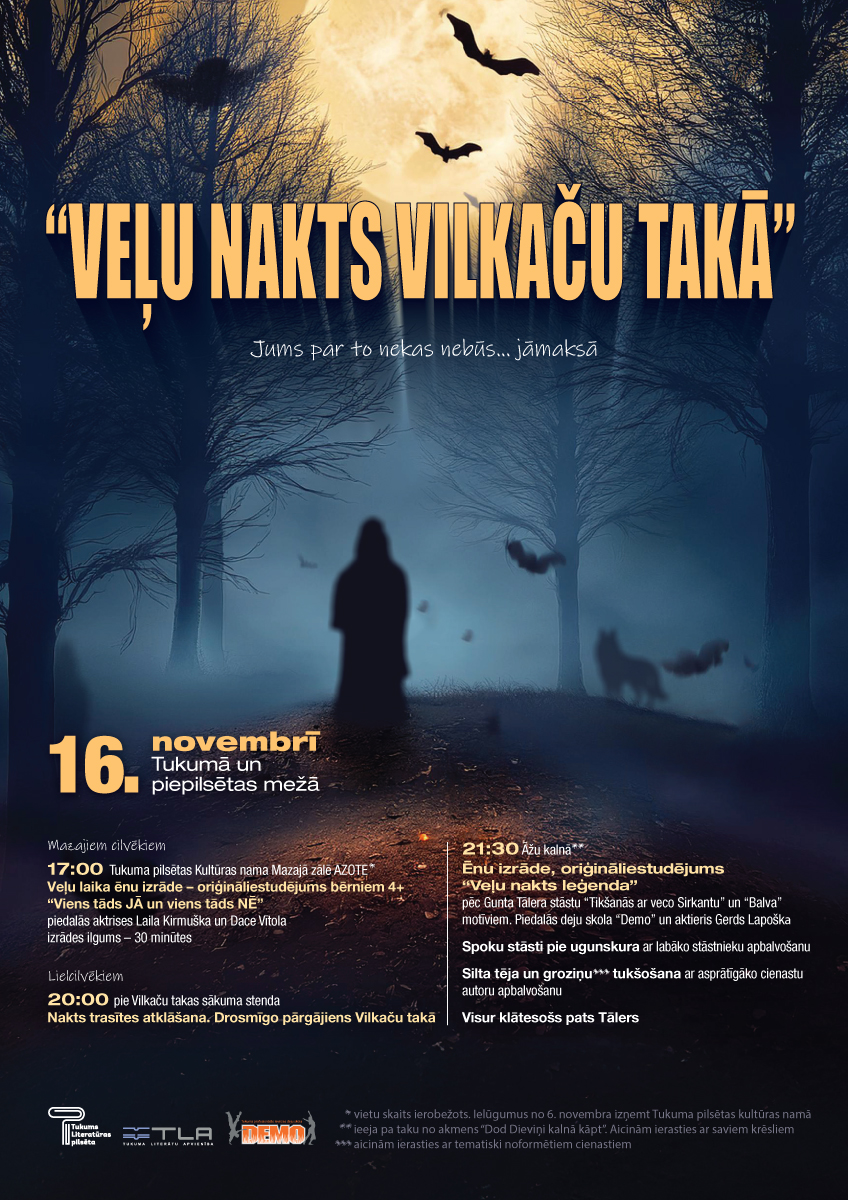 Savukārt 16. novembra pievakarē būs iespēja atvadīties no veļu laika spokainā gaisotnē pasākumā “Veļu laiks Vilkaču takā”. Plkst. 17:00 MAZAJIEM – Tukuma pilsētas kultūras namā oriģinālizrādes – ēnu teātra PIRMIZRĀDE “Viens tāds JĀ un viens tāds NĒ”. Vietu skaits ierobežots. Ielūgumus var saņemt Tukuma Kultūras nama kasē. Vēlāk vakarā plkst. 20:00 LIELAJIEM – baiļu trase Vilkaču takā, pēc tam plkst. 21:30 Āža kalnā ēnu teātra PIRMIZRĀDE “Veļu nakts leģenda”. Pēc izrādes apmeklētāji aicināti baudīt līdzi paņemtos cienastus un dalīties spoku stāstos pie ugunskura. Būs arī balvas – labākajam stāstniekam, un asprātīgākā cienasta autoram. Aicinājums ņemt līdzi savus sēžamos. Adrese: Tukuma pilsētas Kultūras nams, Lielā iela 1, Tukums. Vilkaču taka Raudas mežā, Sēmes pagasts, Tukuma novads