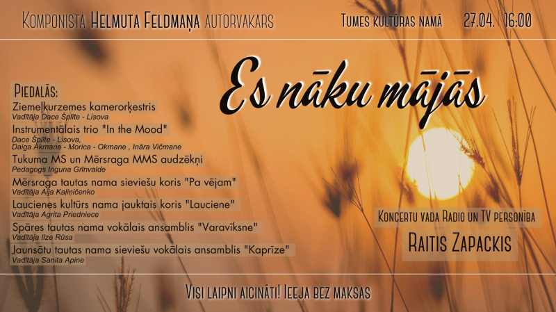 Šā gada 27. aprīlī pulksten 16:00 Tumes kultūras namā uz autorvakaru ielūdz Lielbritānijā dzīvojošais komponists Helmuts Feldmanis. Ideja par šāda veida koncertu radusies pēc vairāku gadu sadarbības ar Tukuma MMS klavierspēles pasniedzēju Ingunu Grīnvaldi. Koncertu vadīs radio un TV personība Raitis Zapackis. Ieeja bezmaksas. Adrese: Tumes kultūras nams, Pasta iela 1A, Tume, Tumes pagasts, Tukuma novads.
