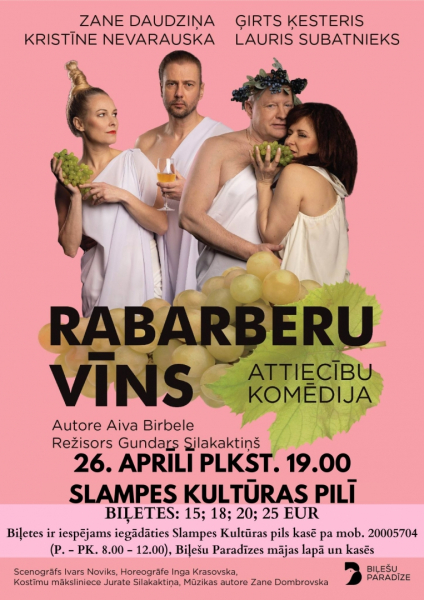 1. aprīlī pulksten 19.00 Slampes Kultūras pilī būs skatāma izrāde “Rabarberu vīns”. Komēdiju autores Aivas Birbeles lugā uz glāzi reibinoša rabarberu vīna satiksies iemīļotie un lieliskie aktieri – Zane Daudziņa, Kristīne Nevarauska, Ģirts Ķesteris un Lauris Subatnieks. Biļetes: 15, 18, 20 un 25 EUR (Biļetes iespējams iegādāties gan www.bilesuparadize.lv, gan Slampes Kultūras pils kasē). Adrese: Slampes Kultūras pils, Slampe, Slampes pagasts, Tukuma novads.