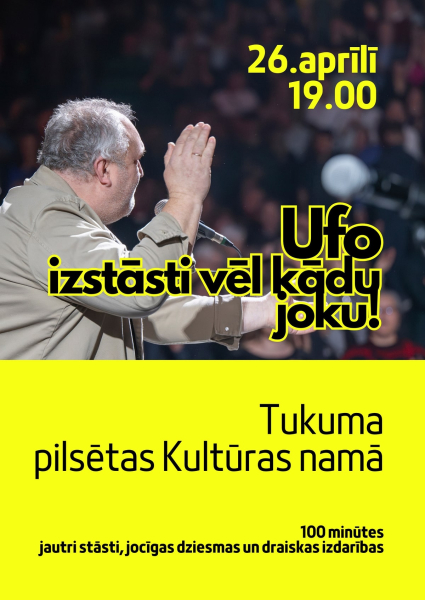 Pēc pagājušā gada pavasara veiksmīgās pasākumu sērijas “Ufo, izstāsti kādu joku”, arī šogad aprīlī – joku mēnesī Ufo dodas ciemos pie skatītājiem ar jautriem stāstiem, jocīgām dziesmām un visādām izdarībām. Ja meklē iespēju aizmirst ikdienas rūpes, nāc 26.aprīlī pulksten 19:00 uz Tukuma pilsētas Kultūras namu! Ieeja 10 EUR. Biļetes “Biļešu Paradīzes” kasēs un internetā.​​ Adrese: Tukuma pilsētas Kultūras nams, Lielā iela 1, Tukums.