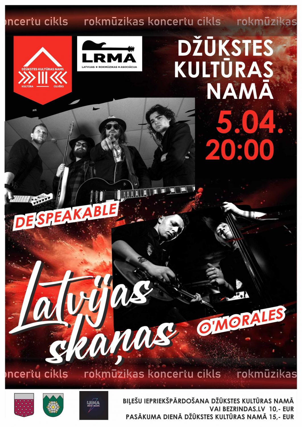 Šis būs rokmūzikas koncertciklu “Latvijas Skaņas” noslēguma koncerts. Šoreiz uzstāsies grupas “DE SPEAKABLE” un “O`MORALES”. Enerģiskas melodijas, spēcīgi ģitāru ritmi un aizraujoša skatuves harizma – šis koncerts solās būt īsti svētki rokmūzikas cienītājiem. Gaidāms neaizmirstams vakars, kurā skanēs gan pazīstami hiti, gan jauni muzikāli pārsteigumi.