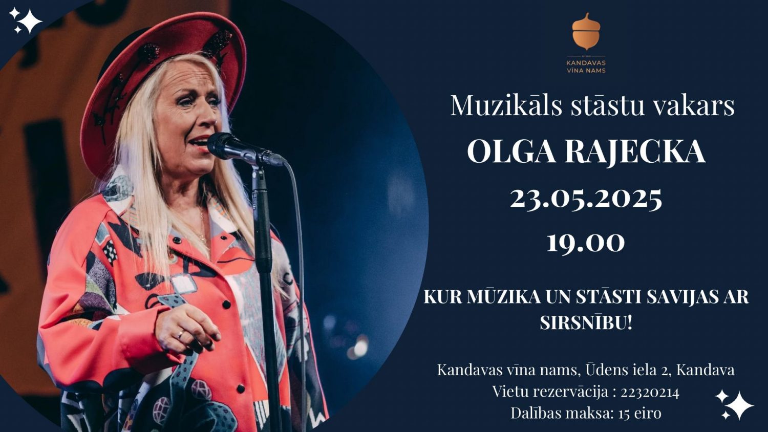 Vīna nama sienās iemājo siltums un sirsnība, kad skatuvi pārņem Olga Rajecka. Vakars, kurā mūzika kļūst par valodu dvēseles sarunai. Vakars, kur staros atmiņas, skanēs dziesmas un mirdzēs patiesas emocijas. Norises vieta: Kandavas Vīna nams, Ūdens iela 2, Kandava, Tukuma novads. Norises laiks: 23.05.2025 plkst. 19:00. Ieejas maksa: 15 EUR. Vairāk informācijas: 22320214