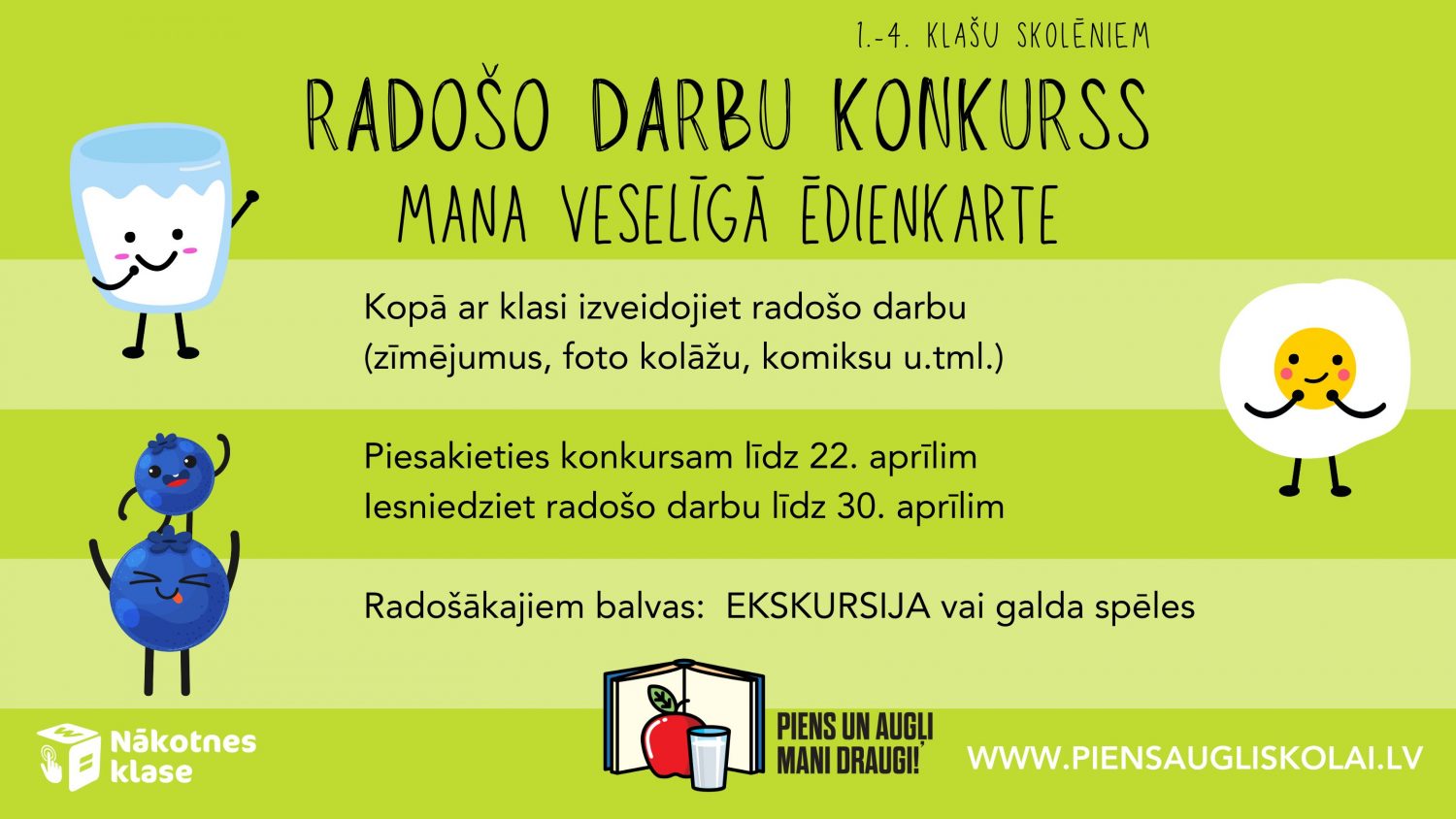 Sacensību gars ir lieliska motivācija zināšanu apguvei, tāpēc Lauku atbalsta dienests sadarbībā ar Ventspils Augsto tehnoloģiju parku aicina 1.- 4. klašu skolēnus piedalīties radošo darbu konkursā «Mana veselīgā ēdienkarte», kas tiek organizēts kā viena no programmas «Piens un augļi skolai»