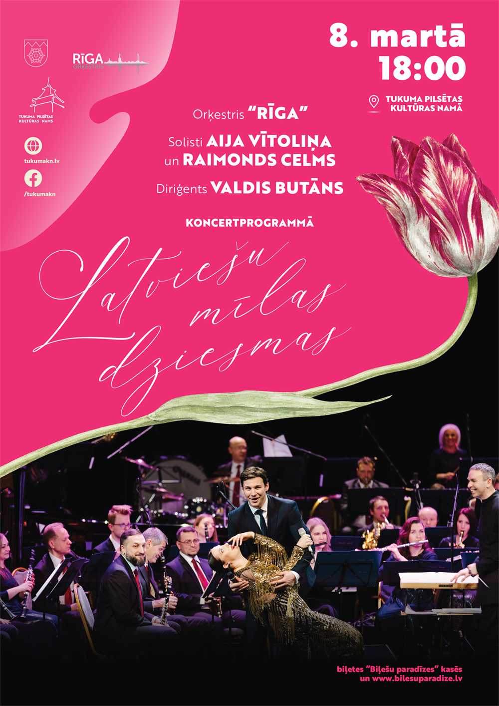 - martā plkst. 18:00 Tukuma pilsētas Kultūras nams aicina uz koncertu “Latviešu mīlas dziesmas”, kurā mīlestība izskanēs caur Latvijas gadalaiku noskaņām. Koncerta pirmajā daļā retro mūzikas atmosfērā atdzīvosies pagājušā gadsimta melodijas, godinot Elgu Igenbergu, Ringoldu Ori, Alfrēdu Vinteru un citus. Otrajā daļā skanēs mūsdienu latviešu komponistu darbi, atklājot mīlestības daudzveidību mūzikā. bilesuparadize.lv Adrese: Tukuma pilsētas Kultūras nams, Lielā iela 1, Tukums. Vairāk informācijas: 28344637, www.tukumakn.lv