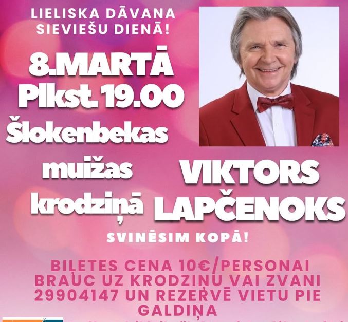 Īpaša Sieviešu dienas svinēšana 8.martā būs Šlokenbekas muižas krodziņā, kur plkst. 19:00 kopā ar leģendāro Viktoru Lapčenoku būs iespēja baudīt gardas vakariņas romantiskā atmosfērā, kur vakaru piepildīs skaista mūzika un neaizmirstamas melodijas. Šis būs lielisks veids, kā pavadīt svētkus sirsnīgā un muzikālā noskaņā! Adrese: Šlokenbekas muiža, Milzkalne, Smārdes pagasts, Tukuma novads. Vairāk informācijas: 29904147