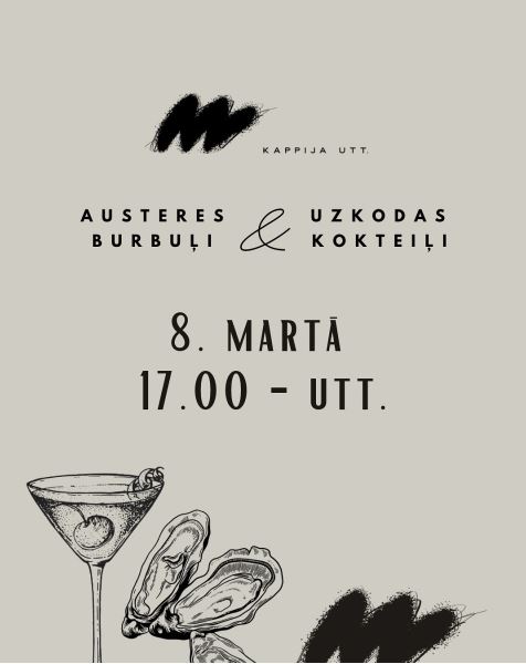 “Malta Kappija” aicina uz elegantu Sieviešu dienas svinēšanu 8.martā ar austerēm, izsmalcinātām uzkodām un dzirkstošiem burbuļiem. Rezervē galdiņu un izbaudi vakaru gardā kompānijā! Dalības maksa: 25 EUR no personas, kas ietver 3 austeres, 2 uzkodas un glāzi crèmant. Pasākums norisināsies no plkst. 17:00 līdz pēdējam klientam. Laiks ļauties garšu baudījumam un īstai svētku noskaņai. Adrese: Pils iela 7, Tukums. Vairāk informācijas: 26410313