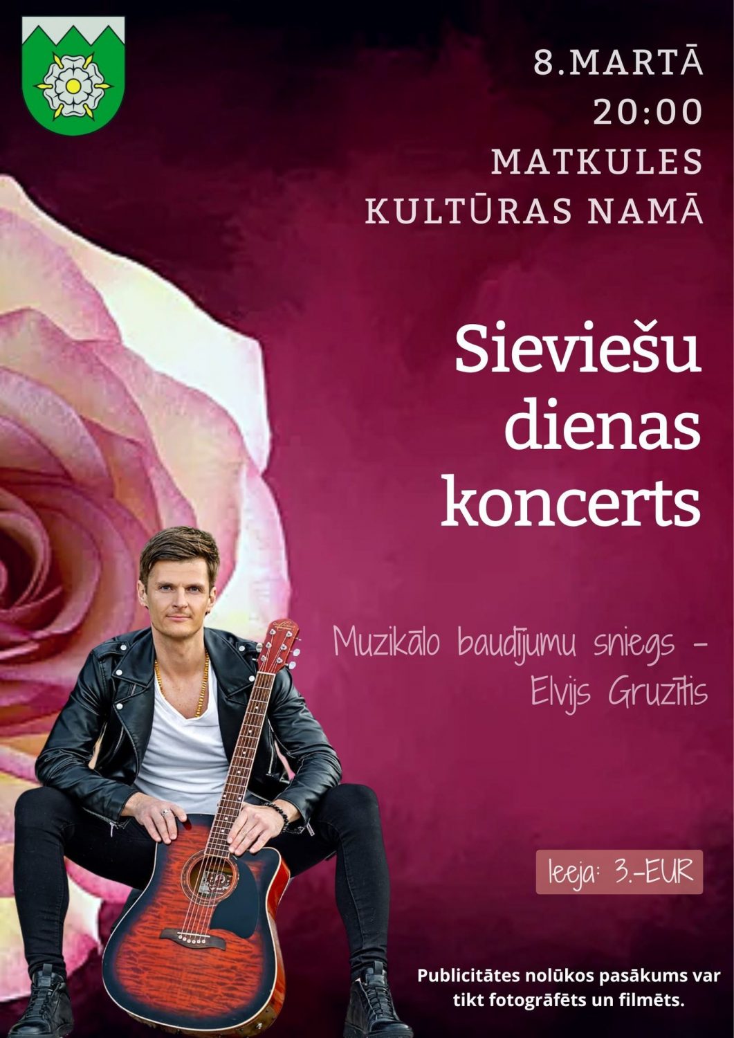 Matkules Kultūras nams 8.martā plkst. 20:00 aicina uz sirsnīgu un muzikāli piepildītu Sieviešu dienas koncertu kopā ar šarmanto Elviju Gruzīti. Maigas balādes, aizraujošas melodijas un siltas emocijas – šis vakars būs īsts baudījums dvēselei un sirdij. Ļaujies mūzikai, kas liek pasmaidīt, sapņot un svinēt sievišķību! Biļetes cena 3 EUR, tā iegādājam kultūras nama kasē. Adrese: Matkules kultūras nams, “Tūjas”, Matkule, Matkules pagasts, Tukuma novads. Vairāk informācijas: 25772208