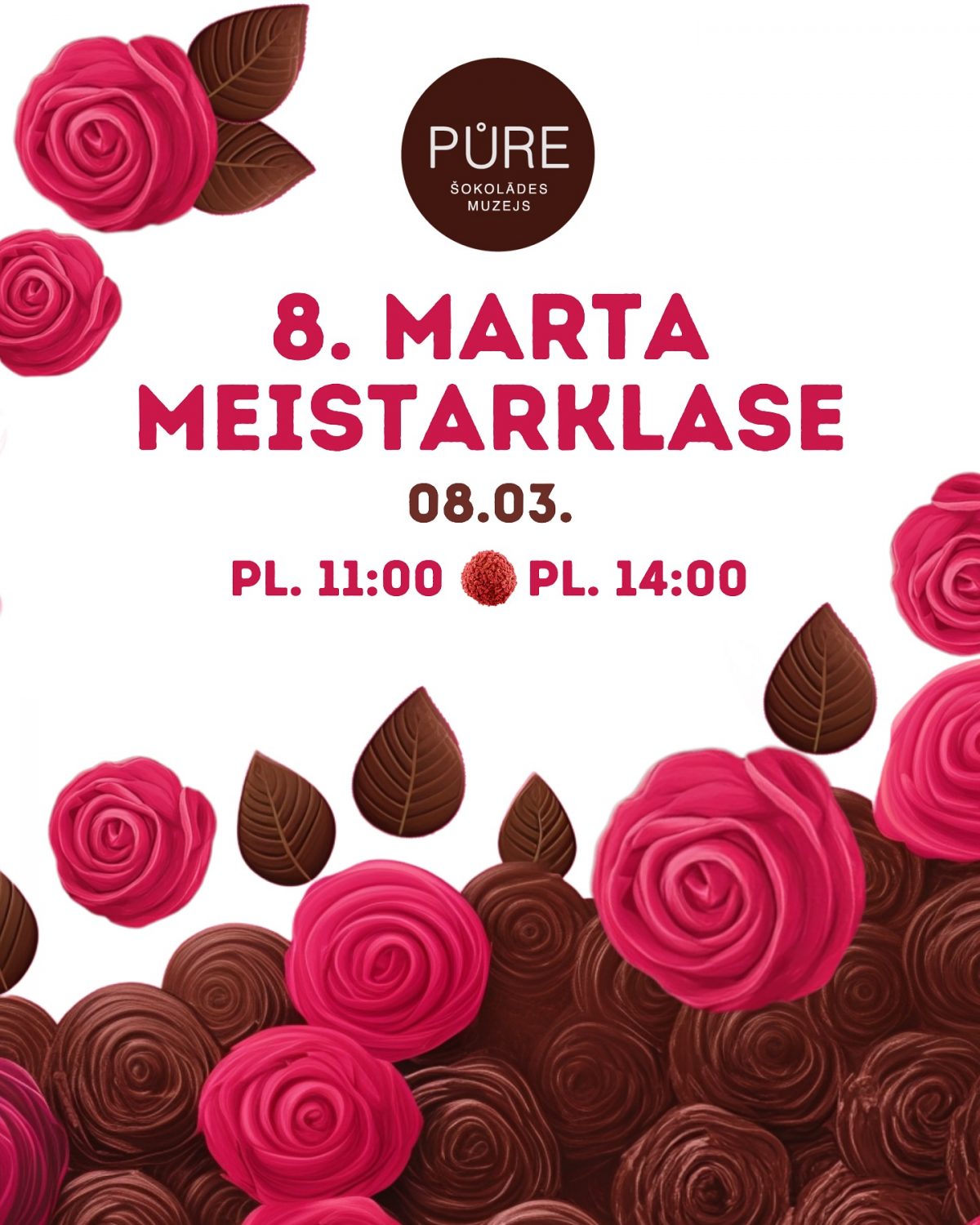Uz Sieviešu dienas Šokolādes meistarklasi Pūres Šokolādes muzejs muzejs aicina mammas, meitas, māsas un draudzenes uz īpašu meistarklasi 8.martā plkst. 11:00 un 14:00, lai gardi un radoši nosvinētu Sieviešu dienu. Dalībnieces iepazīs šokolādes pasaules noslēpumus un pašas gatavos gardas konfektes, trifeles un šokolādes tāfelītes. Pasākumā būs iespēja nogaršot siltu šokolādi un saņemt nelielu pārsteigumu. Ieejas maksa: pieaugušajiem 15 EUR, skolēniem un studentiem 12 EUR, pirmsskolas vecuma bērniem 10 EUR. Adrese: Šokolādes muzejs, Pūre 9, Pūres pagasts, Tukuma novads. Vairāk informācijas: 63180251, www.purechocolate.lv