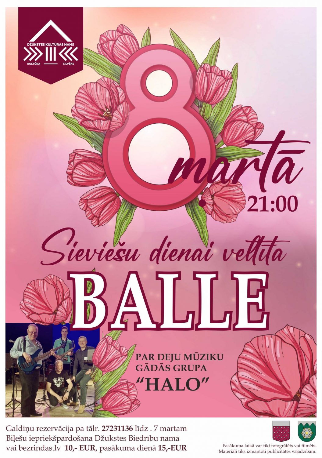 8.martā arī Džūkstes Kultūras namā plkst. 21:00 būs lustīga Sieviešu dienas balle kopā ar pieredzējušo Talsu grupu “HALO!”. Četri lieliski mūziķi ar vairāk nekā 30 gadu pieredzi parūpēsies par neaizmirstamu vakaru, spēlējot iemīļotas latviešu dziesmas un radot īstu svētku noskaņu. Rezervē galdiņu līdz 7. martam, zvanot. Dejas, dziesmas un lieliska atmosfēra garantēta! Adrese: “Biedrību nams”, Džūkste, Džūkstes pagasts, Tukuma novads. Vairāk informācijas: 27231136