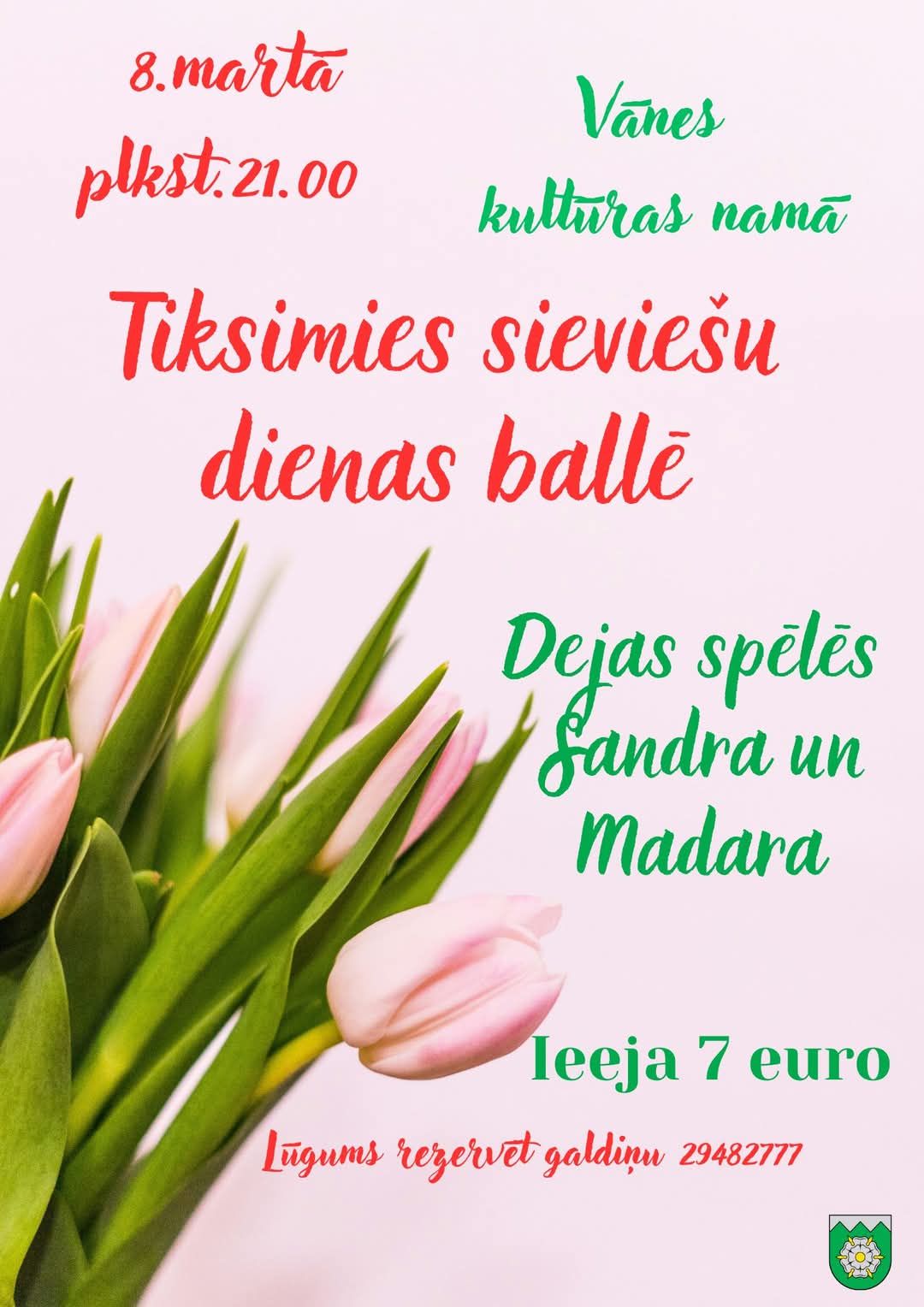 Sieviešu diena ir jāsvin ar dejām un jautru noskaņojumu! Tādēļ 8.marta plkst. 21:00 Vānes kultūras namā aicinām uz sirsnīgu un lustīgu balli pie galdiņiem ar saviem groziņiem. Par deju ritmiem un lielisku atmosfēru rūpēsies Sandra un Madara. Ņem līdzi draugus, labu garastāvokli un ļaujies svētku burvībai! Vietu skaits ir ierobežots, tāpēc galdiņus lūdzam rezervēt savlaicīgi. Adrese: Gaismiņas”, Vāne, Vānes pagasts, Tukuma novads. Vairāk informācijas: 29482777