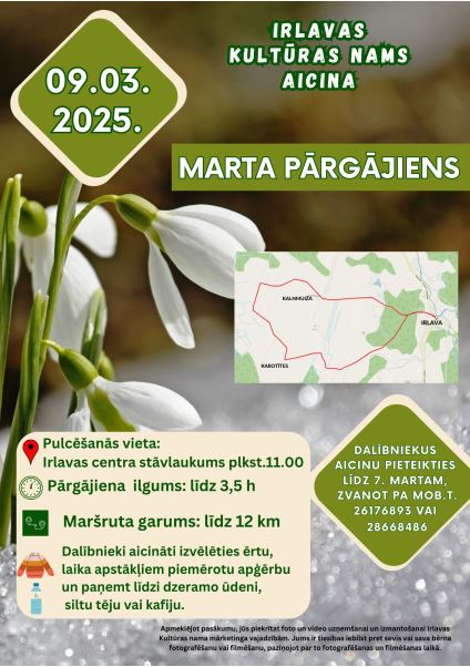 Savukārt 9. martā plkst. 11:00 aicinām uz aktīvu un dabas piepildītu pārgājienu Irlavas apkārtnē! Maršruta garums – aptuveni 12 km. Tā laikā baudīsim skaistus skatus un pavasarīgas noskaņas. Pārgājiena ilgums līdz 3,5 stundām, tāpēc izvēlamies piemērotu apģērbu un parūpējamies par ūdeni vai siltu tēju. Pulcēšanās Irlavas centra stāvlaukumā. Dalība bez maksas. Nāc un izbaudi kustību un svaigu gaisu lieliskā kompānijā! Adrese: Irlavas centra stāvlaukums, “Svēteļi”, Irlava, Irlavas pagasts, Tukuma novads. Vairāk informācijas: 26176893
