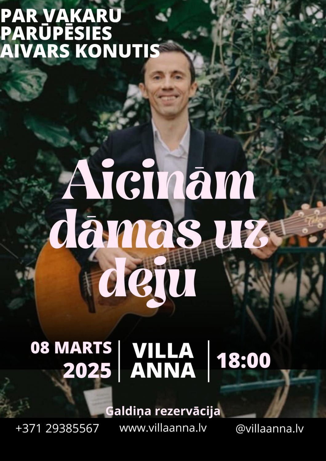 - martā restorāns “Villa Anna” aicina uz īpašu svētku vakaru pie pašas jūras Apšuciemā. Viesus sagaida izsmalcinātas četru kārtu vakariņas, kas radītas ar mīlestību un rūpību, kā arī maģiska atmosfēra, ko papildinās Aivara Konuta ģitāras skaņas. Vakara gaitā varēs baudīt īstu gardēžu maltīti, dzīvo mūziku un jūras mieru, kamēr virs galvas mirdzēs zvaigžņotas debesis. Tā būs lieliska iespēja ļauties romantikai un svinēt sievišķību īpašā gaisotnē. . Adrese: Restorāns “Villa Anna”, Apšuciems, Engures pagasts, Tukuma novads. Vairāk informācijas: 29385567, www.villaanna.lv