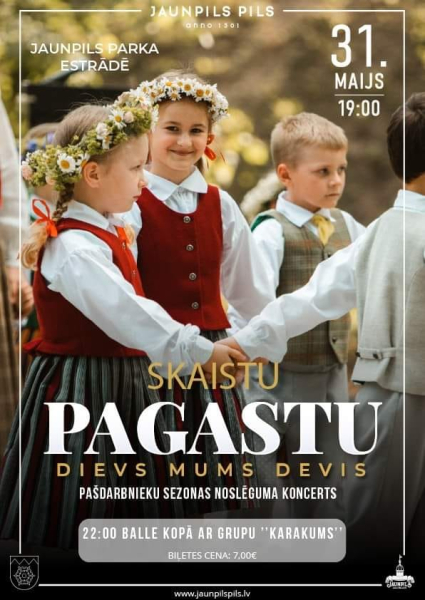 1. maijā pulksten 19.00 Jaunpils parka estrādē notiks Jaunpils pašdarbnieku sezonas noslēguma koncerts “Skaistu pagastu Dievs mums devis!’’. Aicinām izbaudīt skaistu, sirsnīgu un vasarīgu koncertu! Ieeja pasākumā bezmaksas. Pēc koncerta pulksten 22.00 pirmā vasaras zaļumballe ar grupu “Karakums”.