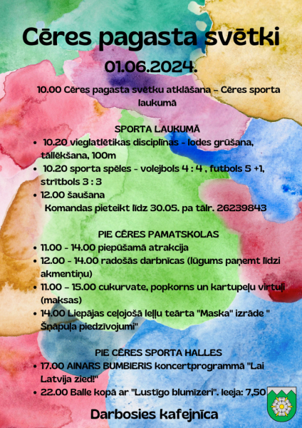 1. jūnijā no pulksten 10:00 visas dienas garumā Cēres pagastā svinēs pagasta un sporta svētkus. Būs gan piepūšamās atrakcijas, gan radošās darbnīcas, gan sportiskās aktivitātes. Savukārt pulksten 14:00 pie Cēres pamatskolas būs iespēja noskatīties muzikālu leļļu teātra izrādi bērniem “Šņāpuļa piedzīvojumi”​​. Ieeja bez maksas. Bet pulksten 17:00 pie Cēres sporta halles visus priecēs Ainars Bumbieris koncertprogrammā “Lai Latvija zied!”. Ieeja bez maksas. Pulksten 22:00 pie Cēres sporta halles – svētku balle ar grupu “Lustīgais blumīzers”.