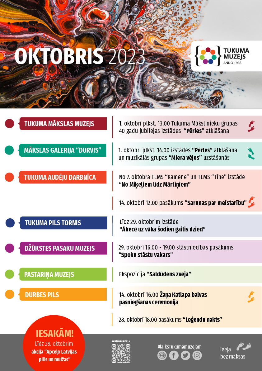 - oktobrī 12.00 Tukuma Audēju darbnīcā pasākums “Sarunas par meistarību”. Tikšanās notiek izstādē “No Miķeļiem līdz Mārtiņiem” ar TLMS “Kamene” un TLMS “Tīne” rokdarbniekiem.