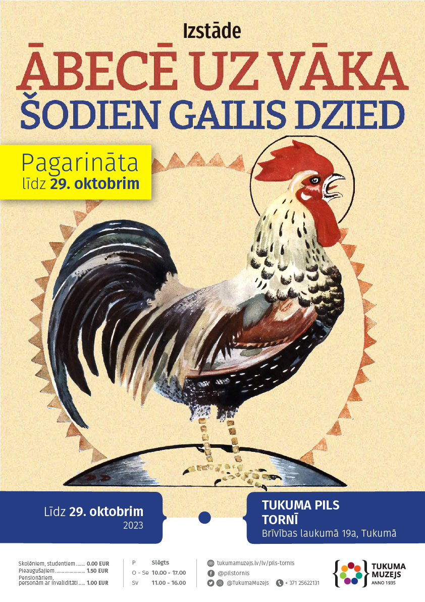 Līdz 29. oktobrim pagarināta Tukuma Pils torņa izstāde “Ābecē uz vāka šodien gailis dzied”, kas ietverta ekspozīcijā “Savējo stāsti, ne svešo”.