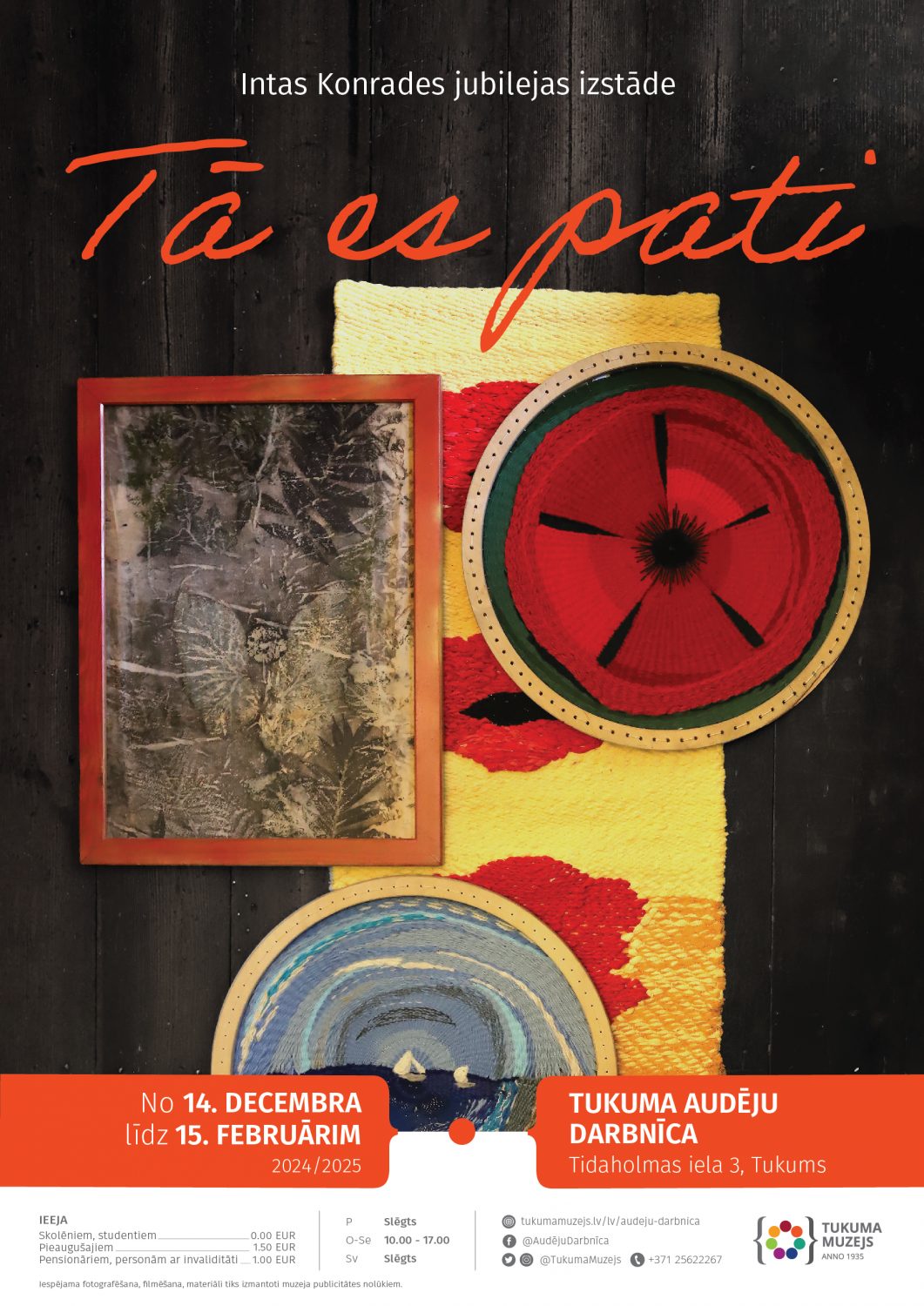 Vēl tikai līdz 15. februārim Tukuma Audēju darbnīcā skatāma Intas Konrades jubilejas personālizstāde “Tā es pati’’.