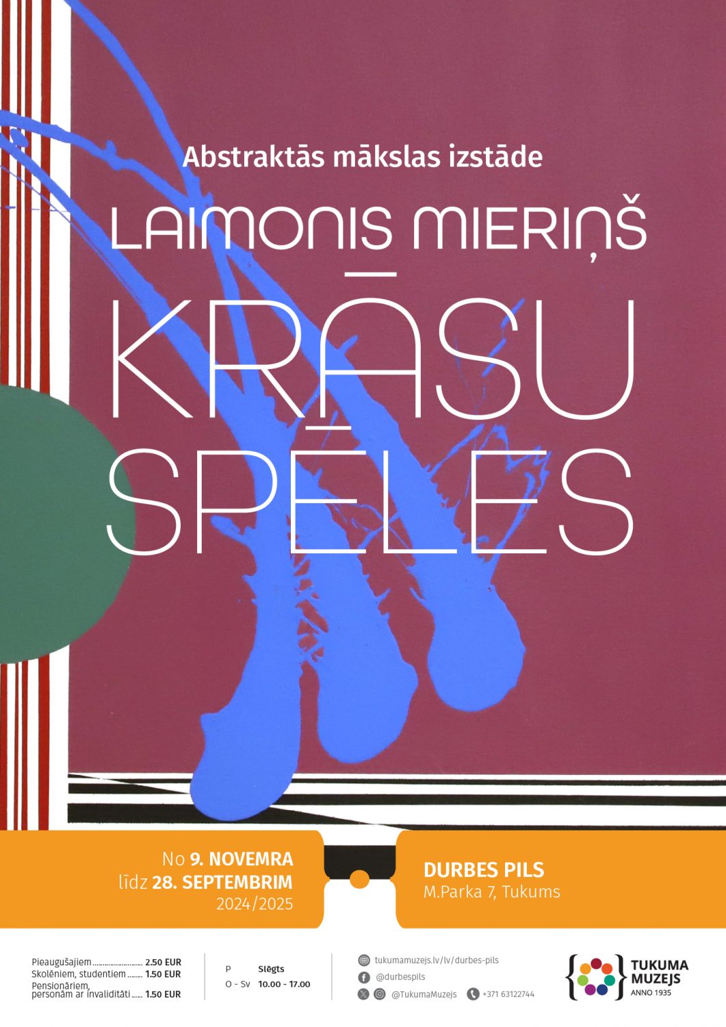 Durbes pilī skatāma abstraktās mākslas izstāde “Laimonis Mieriņš. Krāsu spēles”, kas ir muzeja veltījums mākslinieka 95.dzimšanas dienai. Laimonis Mieriņš ir viens no tiem latviešiem, kurš svešumā ieguvis māksliniecisko izglītību, dēvēts par latviešu izcelsmes britu mākslinieku.