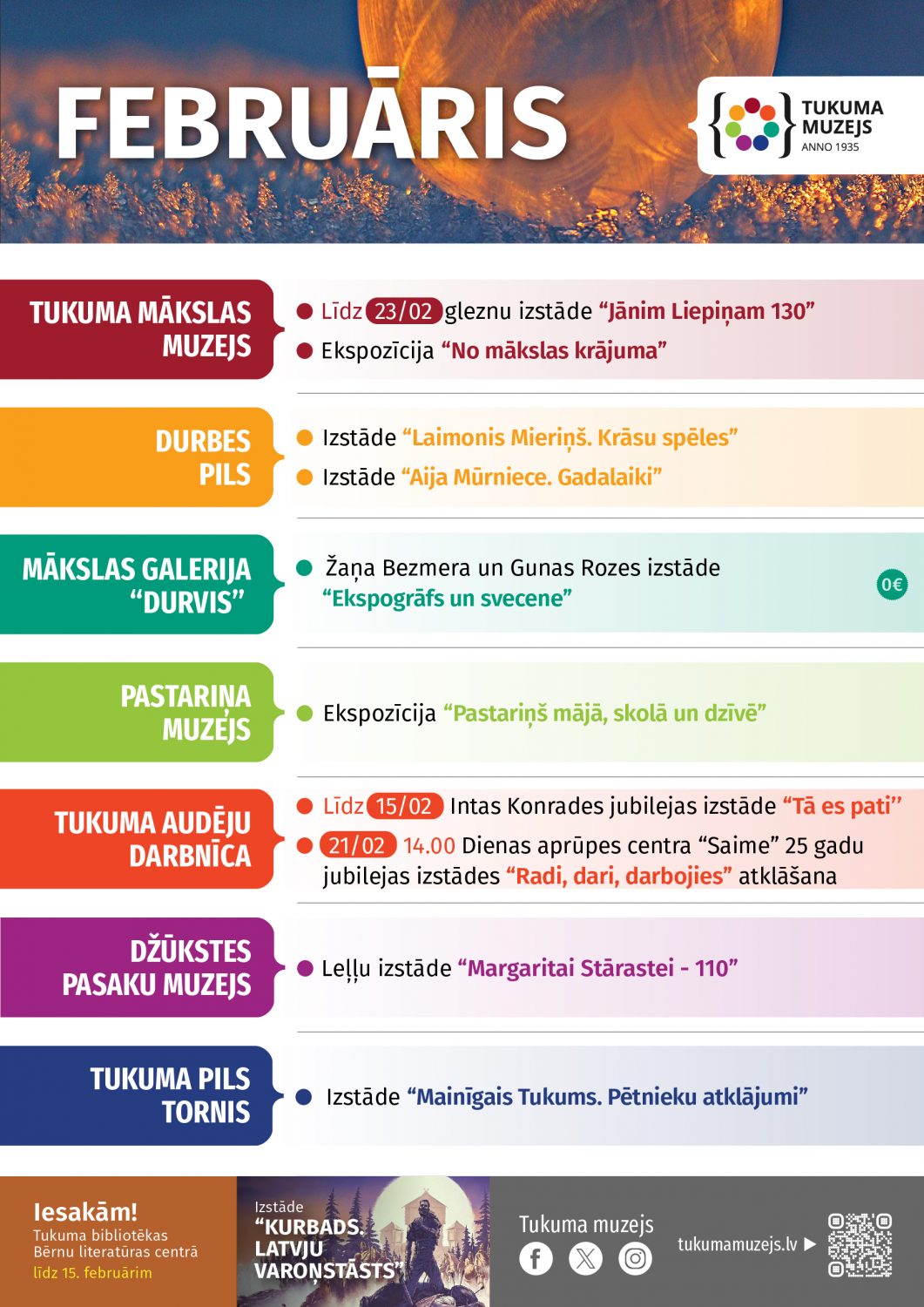 - februārī Tukuma Mākslas muzejā norisināsies konkursa “SMART” 2. noslēdzošā kārta, kurā piedalīsies 4.–6. klašu skolēnu komandas no dažādām Tukuma novada izglītības iestādēm.